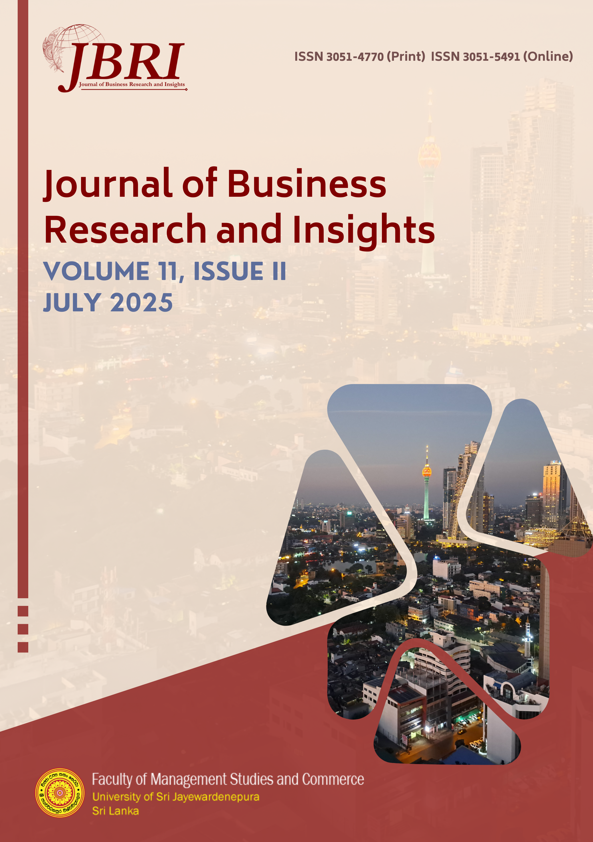Vol. 10 No. 1 (2024)The Faculty of Management Studies and Commerce (FMSC), University of Sri Jayewardenepura (USJ), Sri Lanka publishes the Journal of Business Research and Insights (JBRI) which is a double-blind peer-reviewed journal. JBRI disseminates and shares new knowledge among academics, professionals, and other pertinent parties by publishing high-quality research papers in the areas of business, management, and relevant multidisciplinary studies. FMSC’s management journal was first published in 2002 as Vidyodaya Journal of Management Science, but it was re-launched in 2015 as Vidyodaya Journal of Management. In 2024, the Journal of Business Research and Insights (JBRI) was relaunched, recognizing the need for a more focused platform. The term "Management" had become overly broad, encompassing diverse fields such as Medical Sciences, Technology, Engineering, Allied Health Sciences, Dental Sciences, Urban and Aquatic Bioresources, and Computing Management. The relaunch aimed to provide a dedicated space for research and insights within the business domain, promoting a more targeted and specialized approach to knowledge dissemination. The FMSC is the pioneer in management education in the Sri Lankan university system and it has an eminent history of more than 65 years. The Faculty’s research involvements are a strong indication of innovation and intellectual challenge that demonstrates its leadership in management education in Sri Lanka and the region of South Asia. The JBRI provides a platform to disseminate and share new knowledge, and it encourages researchers to submit their outstanding research work in the broad areas of business, management, and relevant multidisciplinary studies.